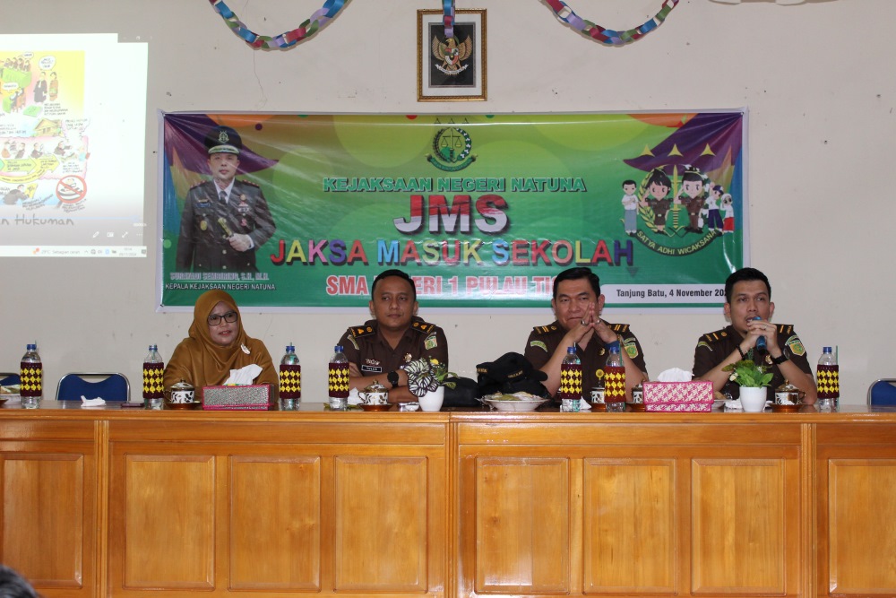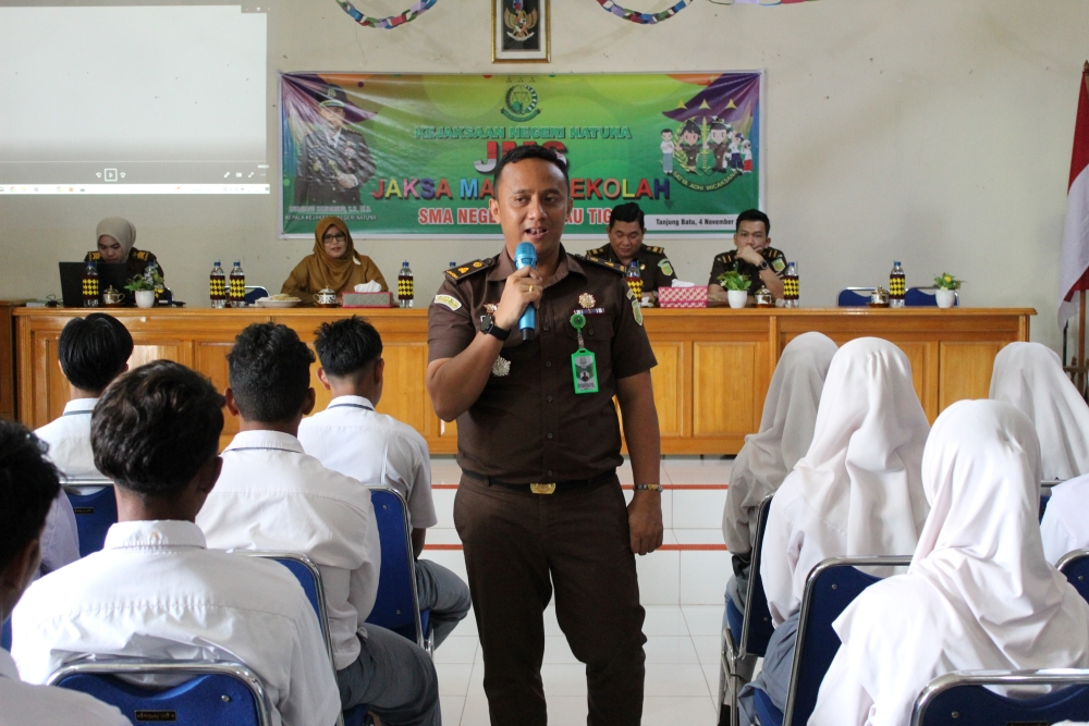 Selasa 05 November 2024, Kejaksaan Negeri Natuna, Kepala Seksi Intelijen, Tulus Yunus Abdi, S.H.,M.H. , Kepala Sub Bagian Pembinaan, Gimpassae Simbolon, S.H.,M.H. , Kepala Sub Seksi A, Yudha Kurniawan, S.H. , dan Tim Intelijen melaksanakan Kegiatan Jaksa Masuk Sekolah di SMAN 1 Pulau Tiga Barat. Kegiatan ini bertujuan untuk memberikan pemahaman kepada para siswa mengenai hukum, pentingnya kesadaran hukum, serta peran jaksa dalam sistem peradilan Indonesia. Pada kegiatan ini, jaksa dari Kejaksaan Negeri Natuna mengunjungi sekolah untuk memberikan penyuluhan hukum secara langsung kepada para siswa. Dalam kesempatan ini, para siswa diberikan informasi mengenai berbagai jenis tindak pidana yang sering terjadi di kalangan remaja, seperti penyalahgunaan narkoba, perundungan (bullying), serta pelanggaran hukum lainnya yang mungkin tidak mereka sadari.
