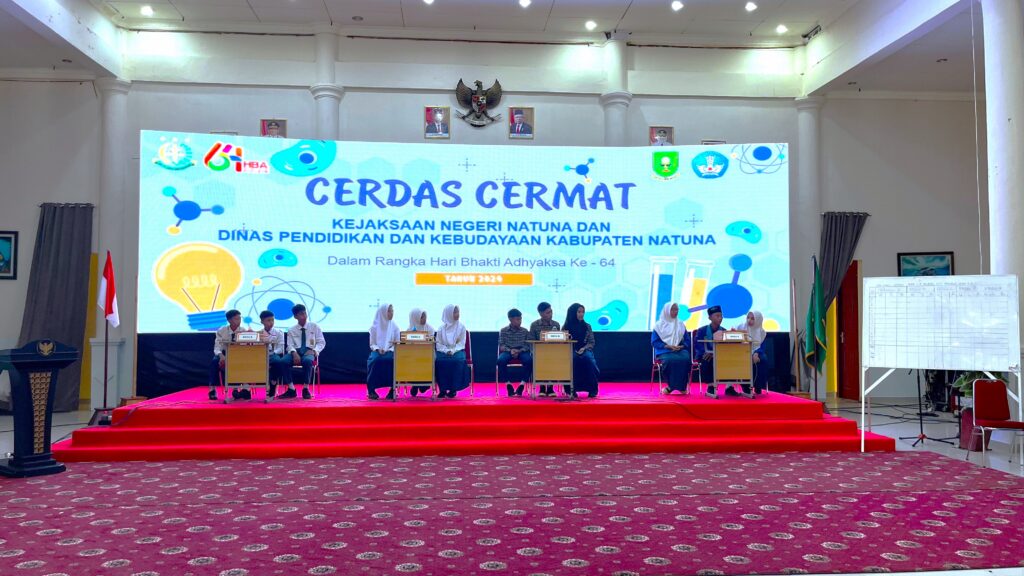 Ranai, Minggu tanggal 21 Juli 2024 di Gedung Sri Srindit Kecamatan Bunguran Timur, Natuna. Kepala Kejaksaan Negeri Natuna yang di wakili oleh Kasi Intel, Tulus Yunus Abdi, S.H.,M.H. didampingi Kasi Pidsus, Denny, S.H dan Kasi Pidum Rein Lesmana Musri, S.H. menyampaikan, Kejaksaan Negeri Natuna bekerja sama dengan Dinas Pendidikan Dan Kebudayaan (DISDIKBUD) menyelenggarakan lomba cerdas cermat tingkat Sekolah Menengah Pertama (SMP).