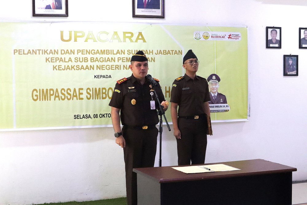 Selasa, 8 Oktober 2024 Upacara Pelantikan dan Pengambilan Sumpah Jabatan Kepala Sub Pembinaan pada Kejaksaan Negeri Natuna, Bapak Gimpassae Simbolon, S.H., M.H., bertempat di Aula Kantor Kejaksaan Negeri Natuna.